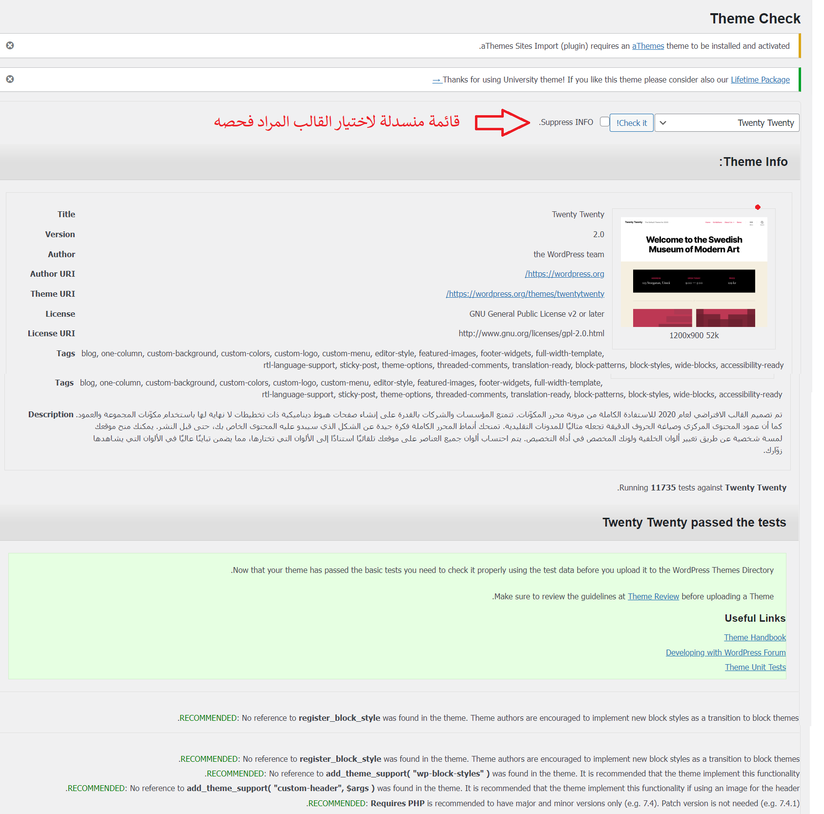اختر من القائمة المنسدلة اسم القالب الذي تريد فحصه ثم انقر فوق زر لتبدأ الإضافة عملها وتجمع لك معلومات عامة حول القالب ونتتجة الاختبارات التي تم إجراؤها على هذا القالب وهل اجتازها أم لا..