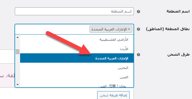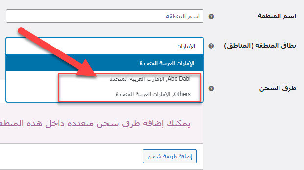 لكن في حالة الإمارات تستطيع فقط تعيين سعر الشحن للدولة نفسها، وذلك لأن المدن داخل الإمارات لا تظهر في المناطق المدعومة في ووكومرس: