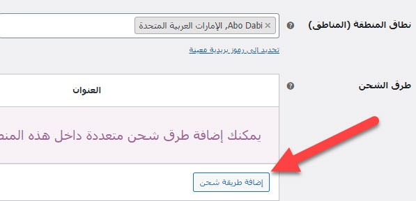 الأن يمكننا تعيين سعر الشحن داخل أبوظبي، من خلال اختيار المنطقة AboDhabi، ثم النقر على إضافة طريقة شحن: