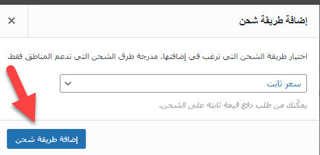 سيظهر تبويب إضافة طريقة شحن والذي نختار منه (سعر ثابت)، ثم إضافة طريقة شحن: