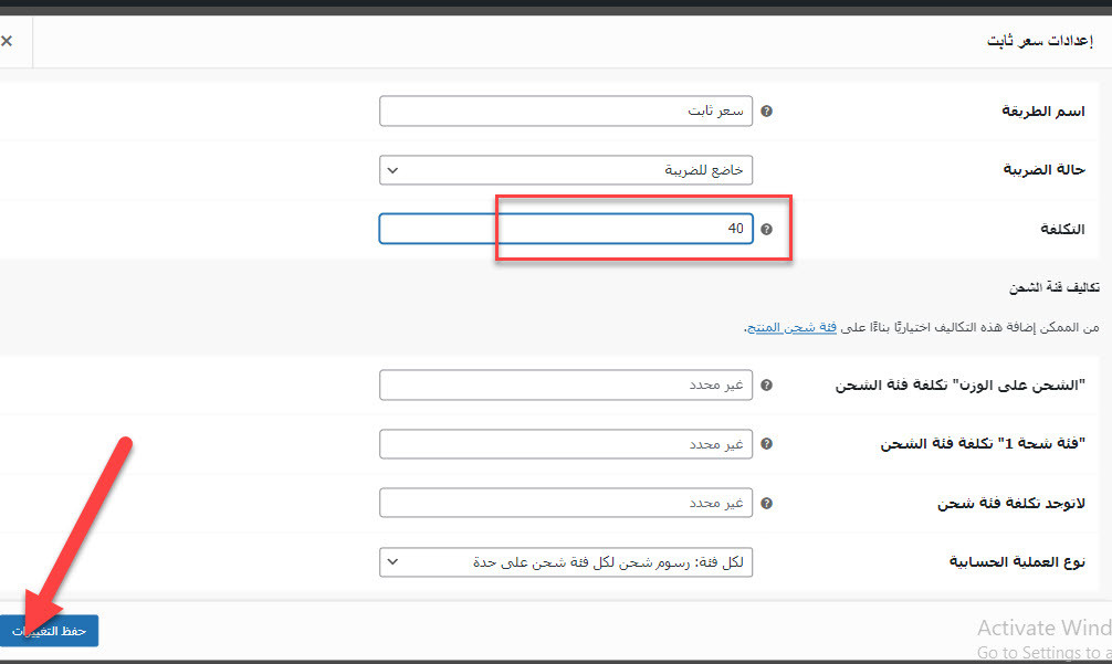 بعد ذلك نقوم بتعيين سعر الشحن وهي 40 درهم في هذه الحالة: