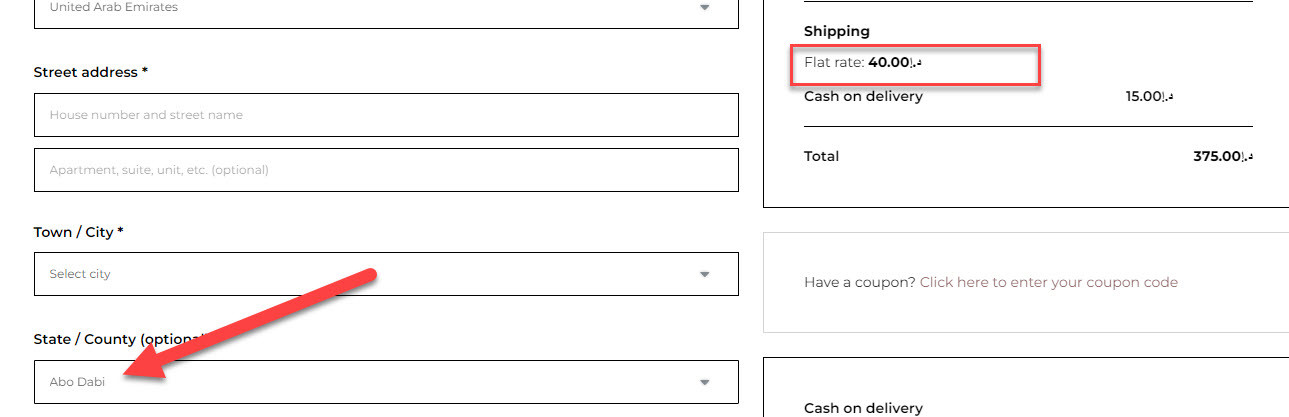 الأن في صفحة الدفع، عندما يقوم العميل باختيار المنطقة AboDhabi سوف يظهر سعر الشحن تلقائيا 40 درهم، وعند اختيار مناطق أخرى سيظهر سعر الشحن 60 درهم تلقائياً: