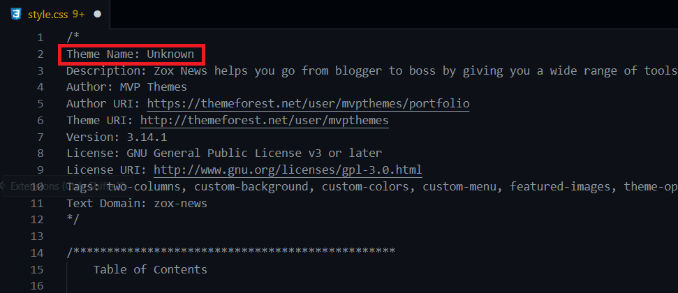 بعدها افتح ملف تنسيقات القالب style.css بمحرر الأكواد وسترى اسم القالب style.css مكتوبًا في بداية الملف بجانب عبارة Theme Name وقم بإعادة تسمية القالب واحفظ التغييرات على الملف كما يلي