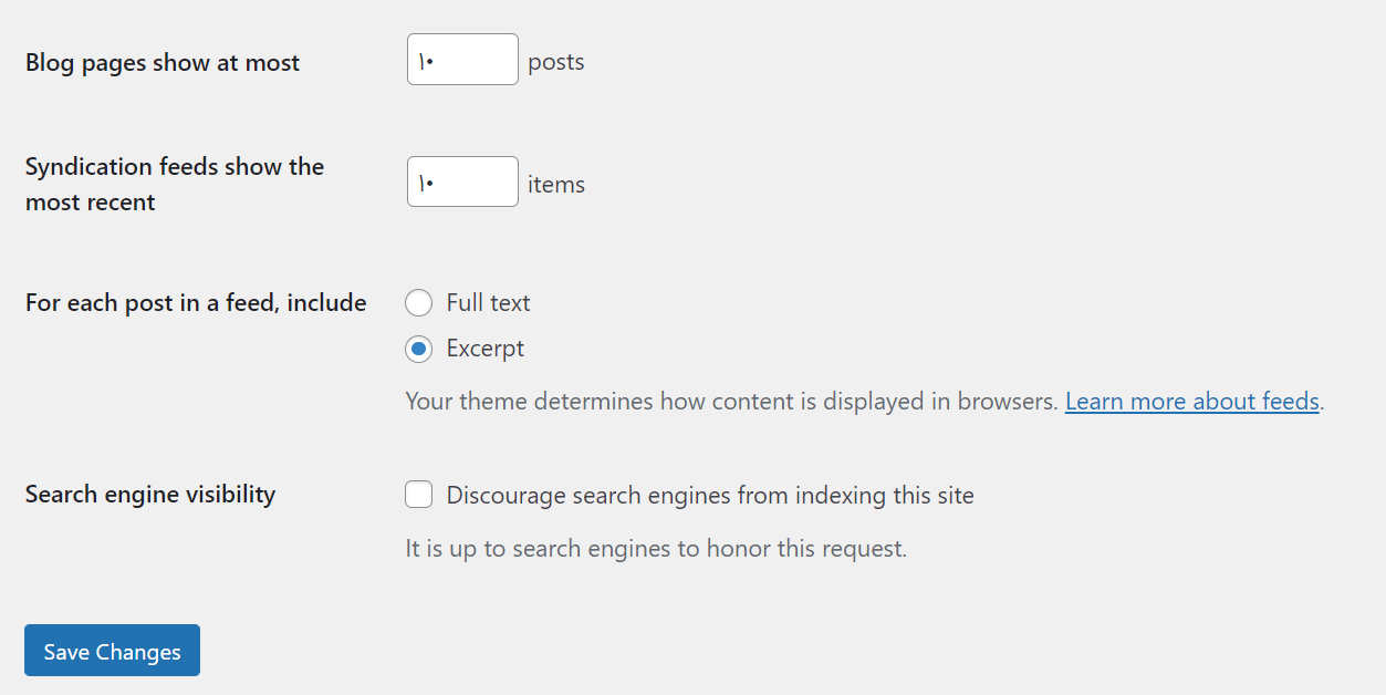 أما فيما يخص عدد الموضوعات المعروضة في الصفحة، فذلك يعني عدد المشاركات التي ستظهر في جميع صفحات الموقع المخصصة لغرض سرد المقالات (المشاركات).