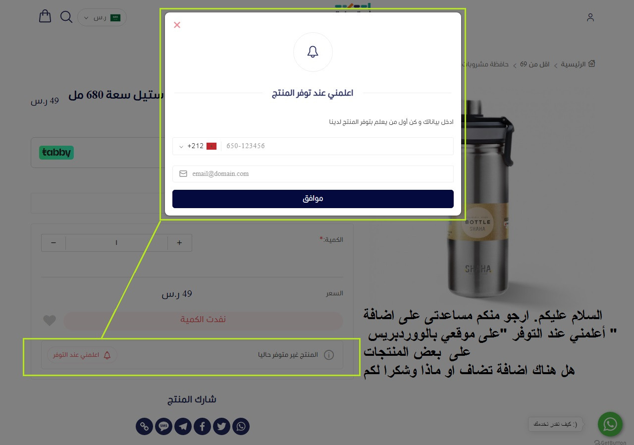علي ملص mohamed وعليكم السلام ورحمة الله وبركاته. الإضافة التي ذكرتُها لا تحقق لك مثل ما هو موجود في الصورة بالضبط، لكنها تمكنك من إضافة وظيفة إعلام الزائر عند توفر المنتج عن طريق الإيميل. يمكنك النقر على اسم الإضافة في الأعلى، ومشاهدة معرض الصور الخاص بالإضافة في أسفل الصفحة لتأخذ فكرة أوضح عما يمكنك تحقيقه من خلالها.