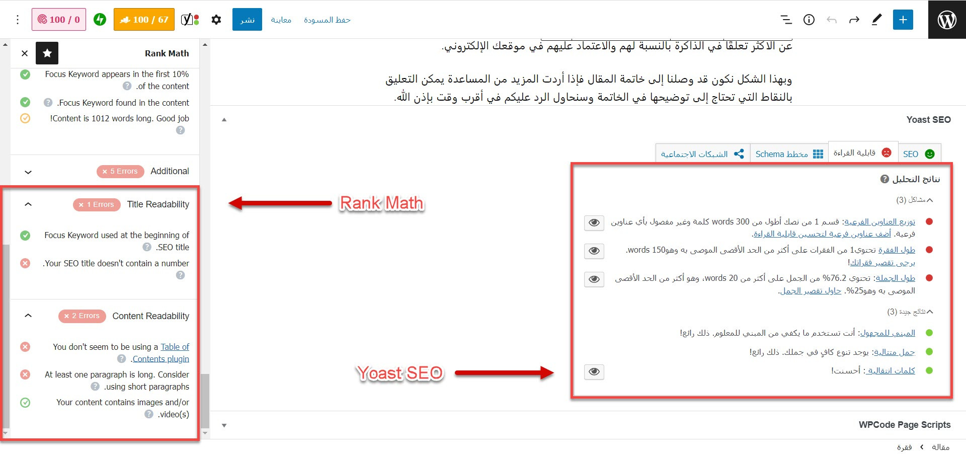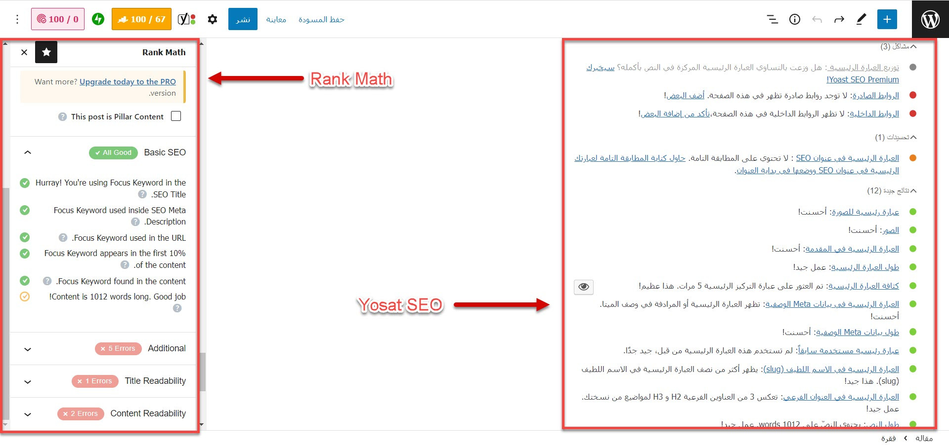 وعند مقارنة نفس المقال على كلاً من إضافة Yoast SEO وإضافة Rank Math كان النتيجة كما موضح في الصورة التالية: