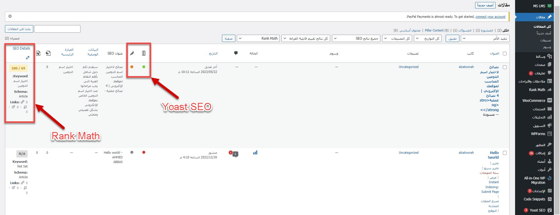 كما أن كلا الاضافتين تقدم دليل مختصر عن أداء المقال في صفحة المقالات الرئيسية التي تساعدك في سرعة فحص مقالات موقعك وتحديد المشاكل الأساسية، ولكن إضافة Rank Math توضح الكلمة المفتاحية والروابط الداخلية والخارجية وأكواد Schema بالإضافة إلى تقييم المقال الإجمالي على عكس إضافة Yoast SEO توضح تقييم السيو بشكل عام وقابلية القراءة وكذلك كالمعتاد مؤشرات لونية دون دليل رقمي.