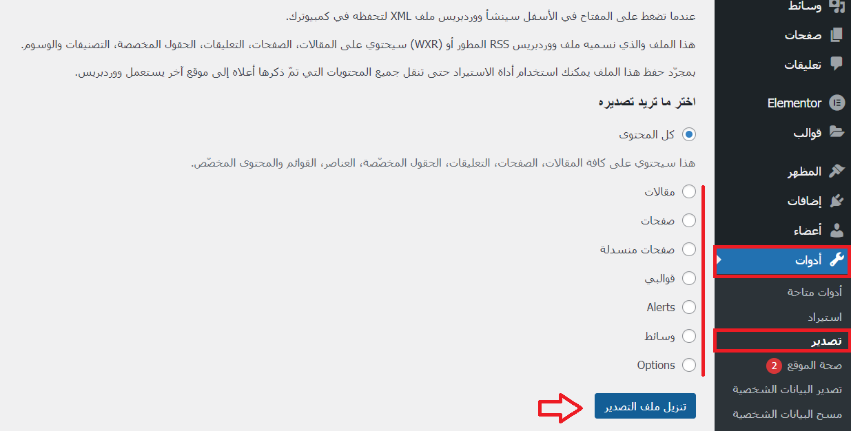 يوفر نظام ووردبريس أداتي استيراد وتصدير افتراضية تمكنانك من تصدير محتوى البيانات التجريبية لموقعك بسهولة بصيغة ملف xml.