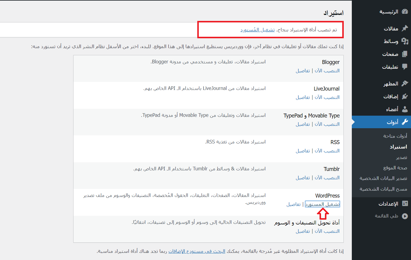 يتم بعدها تنزيل ملف المحتوى بامتداد xml على جهازك المحلي ويمكنك تضمينه مع مجلد القالب وتوجيه المستخدم ليستورده من خلال أداة الاستيراد المدمجة في ووردبريس والتي يصل لها كذلك من خلال لوحة تحكم الموقع ثم أدوات > استيراد> تشغيل المستورد