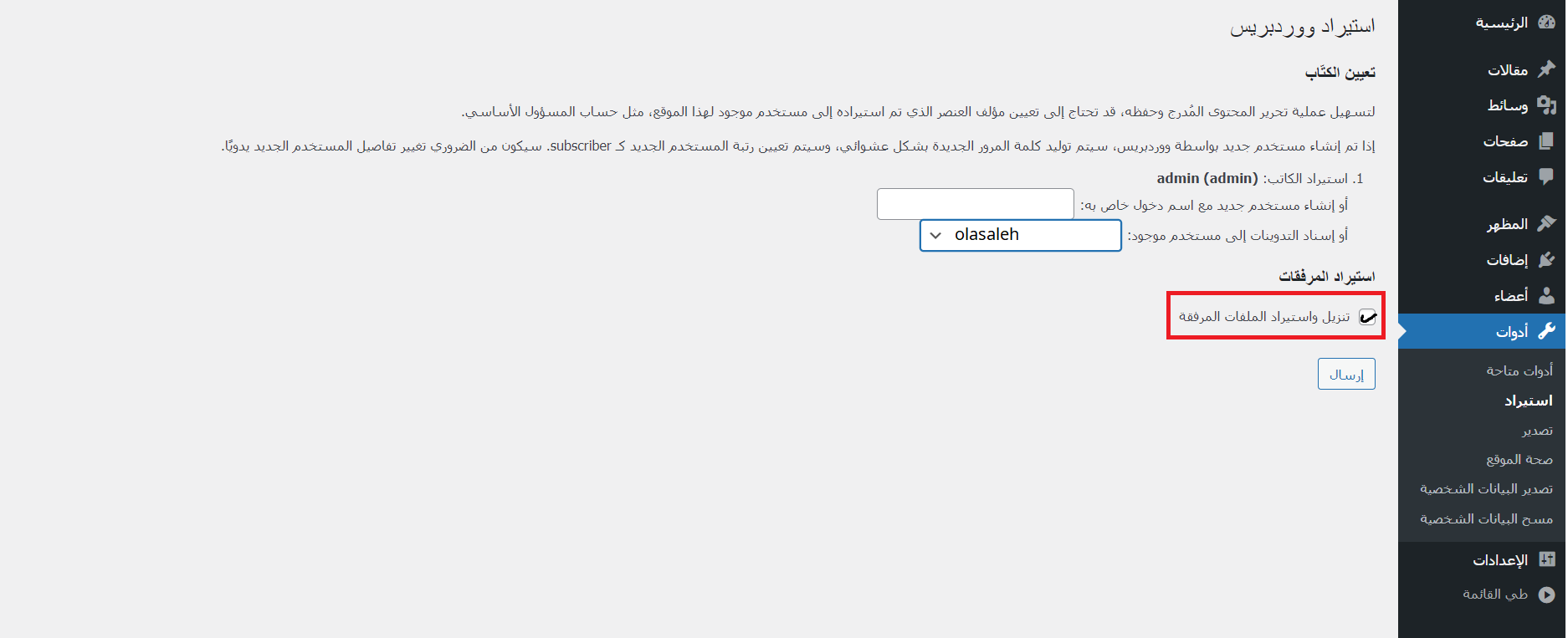 ثم القيام برفع ملف xml الذي أنشأه في مرحلة التصدير ويفضل ان تسند المقالات إلى مستخدم موجود وتقوم بتحميل الملفات المرفقة