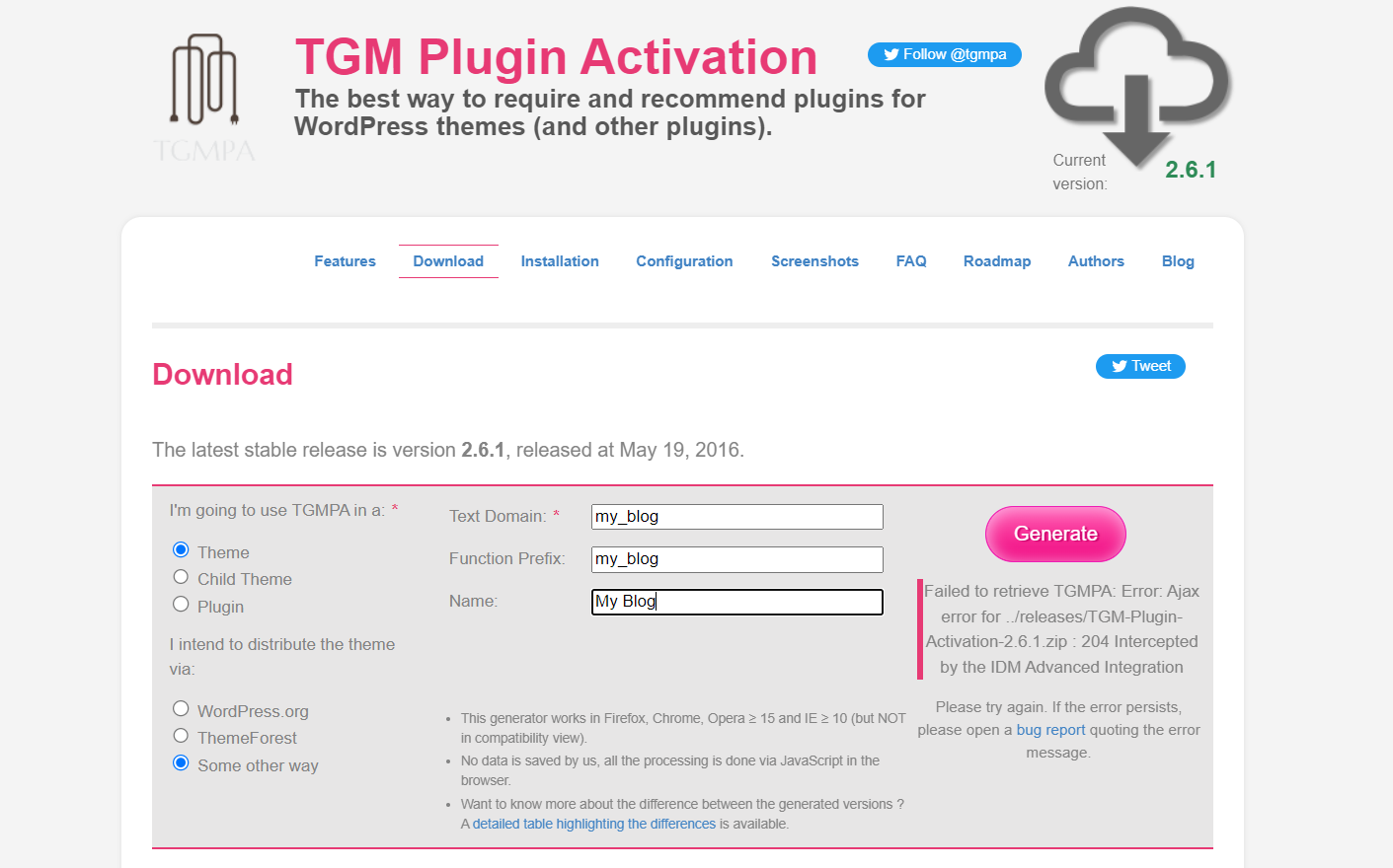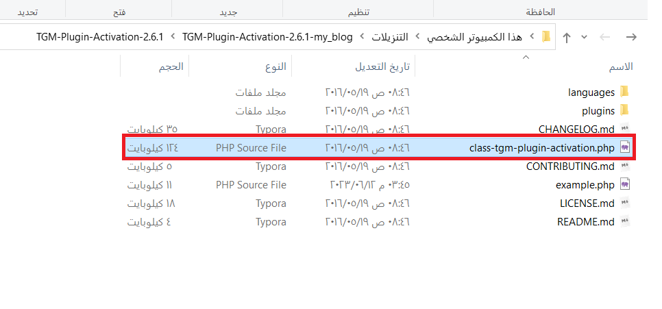 بعدها انقر فوق Generate سيتم تنزيل ملف مضغوط TGM-Plugin-Activation-2.6.1.zip إذا قمت بفك ضغطه ستحصل على مجلد يتضمن مجموعة من الملفات كما في الصورة التالية