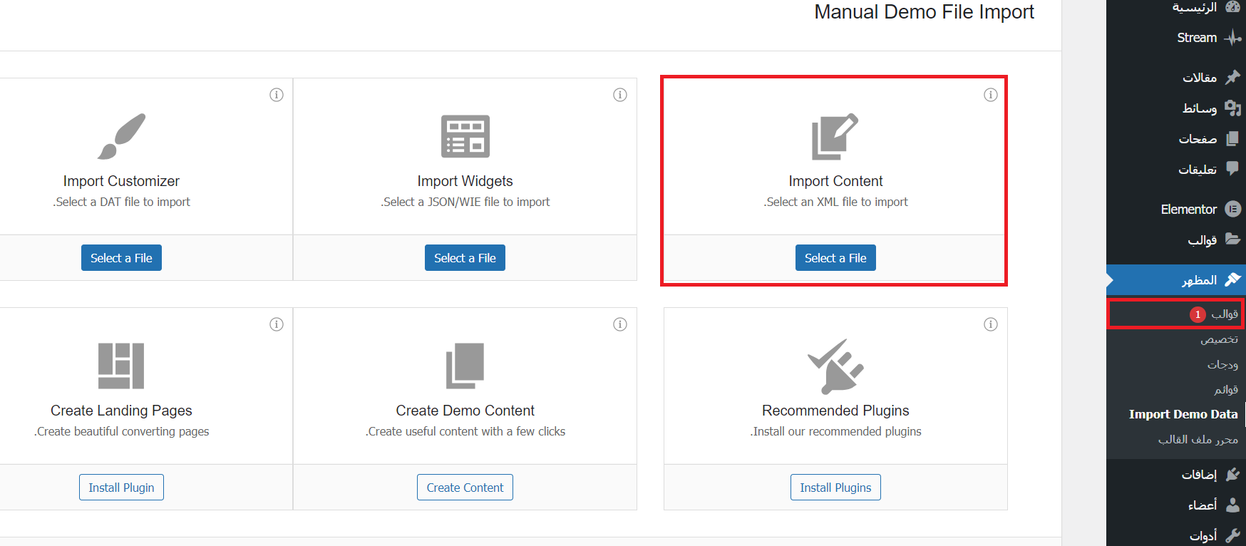 توفر هذه الإضافة ثلاث طرق أساسية لاستيراد المحتوى التجريبي الخاص قالب ووردبريس وهي