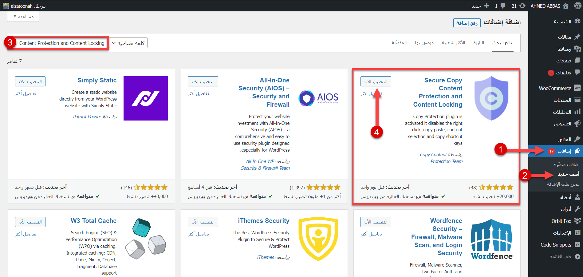 على سبيل المثال إضافة Secure Copy Content Protection and Content Locking تقوم بالدخول على لوحة الووردبريس الرئيسية ومن القائمة الجانبية تختار إضافات ثم تختار أضف جديد وتبدأ في البحث عن الإضافة وبعد أن تظهر لك تقوم بالضغط على التنصيب الآن وبعد الإنتهاء من التنصيب تقوم بتفعيل الإضافة وذلك كما موضح في الصورة التالية: