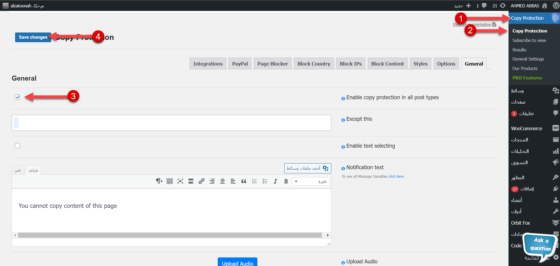 وبعد ذلك تقوم بالرجوع إلى لوحة الووردبريس الرئيسية وتختار Copy Protection من القائمة الجانبية ومنها تختار Copy Protection أيضَا وبعد ذلك تقوم بتفعيل خيار Enable Copy Protection in all post types ثم تضغط على Save Changes وذلك كما موضح في الصورة التالية: