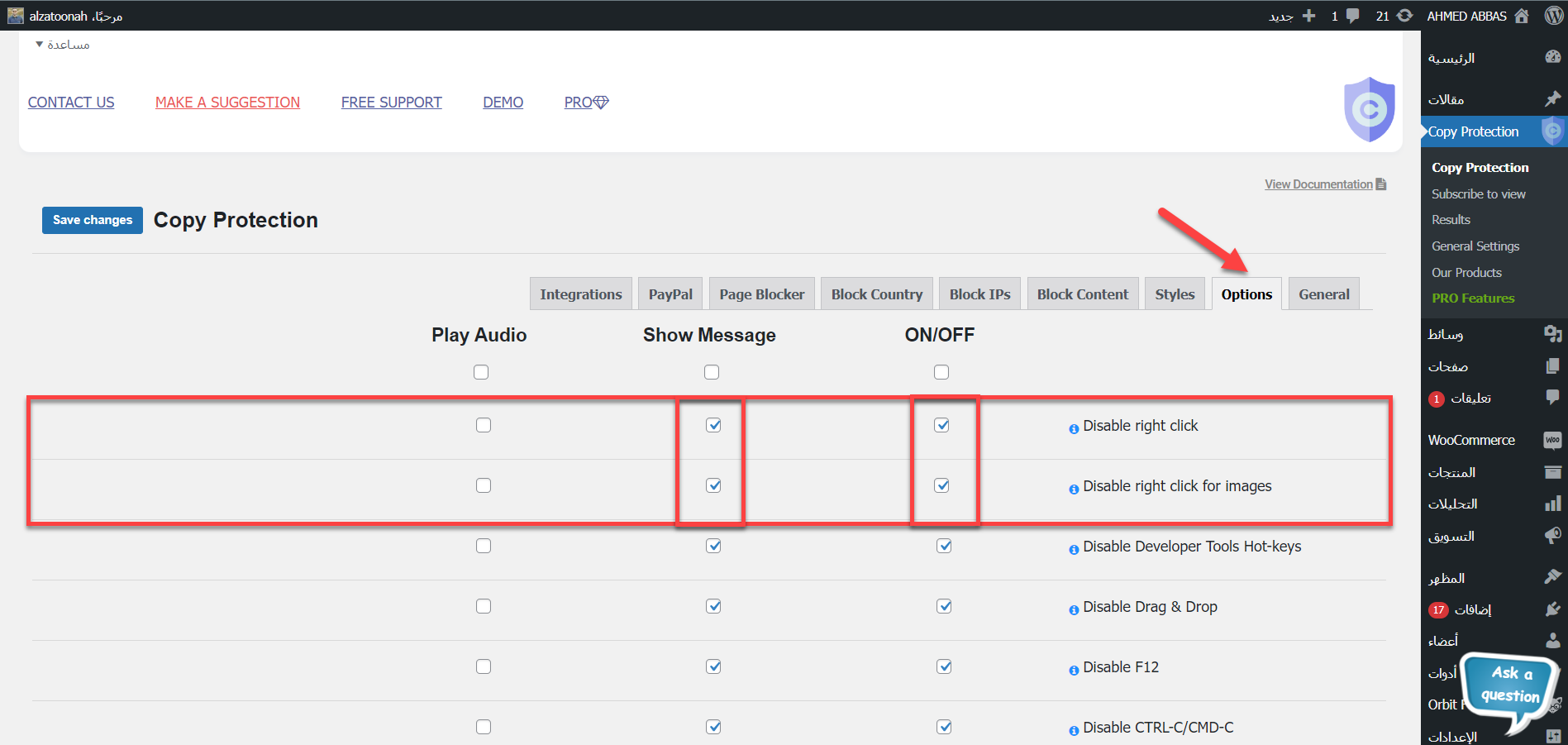 فتقوم بالدخول إلى إضافة Secure Copy Content Protection and Content Locking مرة أخرى ثم تختار Options من القائمة العلوية وبعد ذلك تقوم بتفعيل خيار Disable right click وخيار Disable right click for images وكذلك تفعيل ظهور رسالة التحذير وبعد ذلك تقوم بالضغط على Save Changes وذلك كما موضح في الصورة التالية: