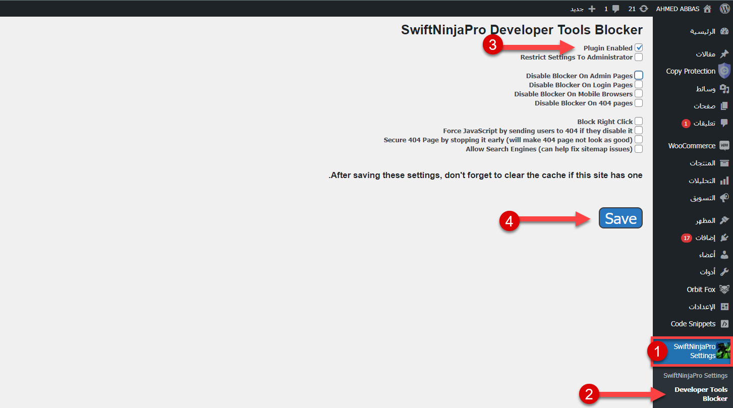 وبعد ذلك تقوم بالرجوع إلى لوحة الووردبريس الرئيسية وتختار SwiftNinjaPro Settings ومنها تختار Developer Tools Blocker.
