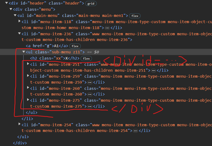 سيؤدي هذا الكود المهمة على أكمل وجه إن شاء الله، إذ إنه يقوم بتغليف جميع عناصر الـ li للقائمة الفرعية بـ div في حال كانت القائمة الفرعية (عنصر الـ ul الخاص بها) تمتلك الكلاس sub-menu، ويعطي الـ div الذي يتم إضافته الكلاس sub-menu-items حتى يكون بإمكانك تخصيص القائمة كما تريد.