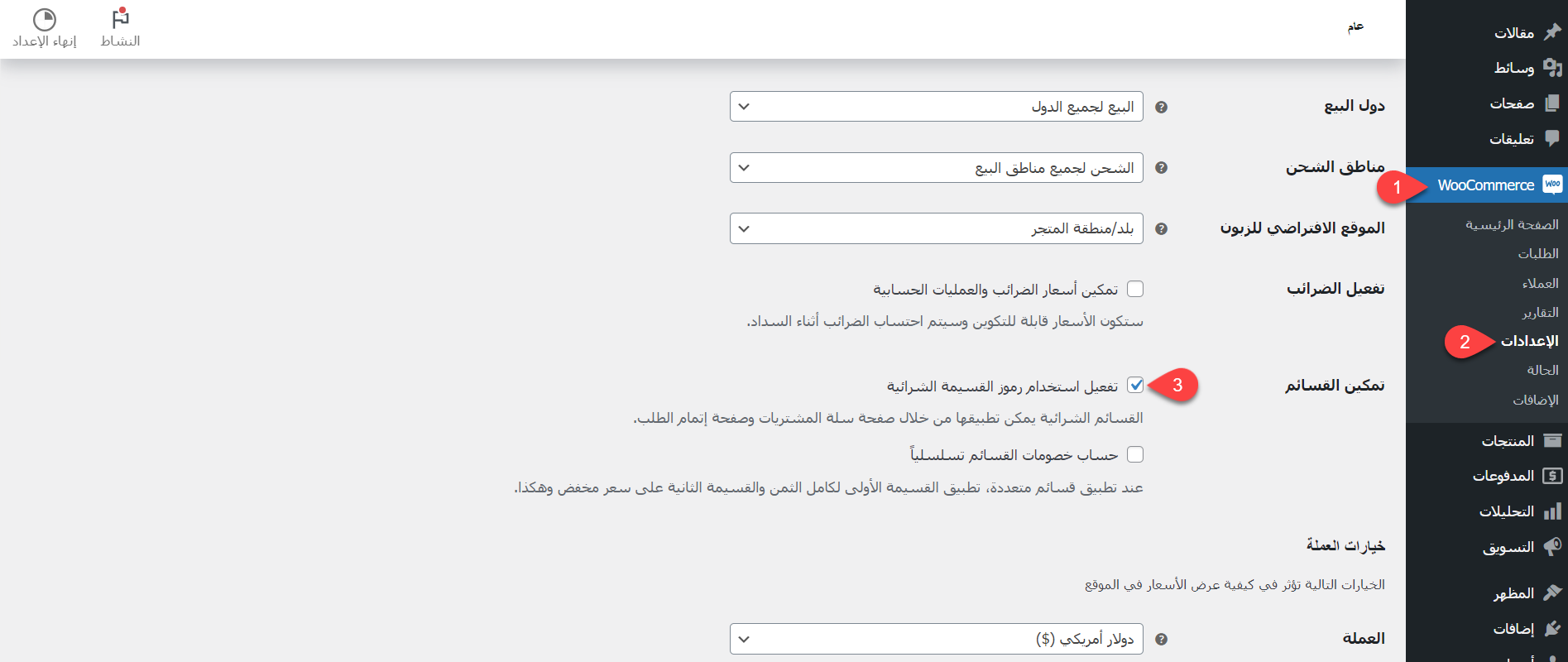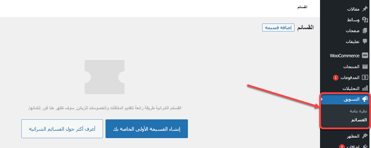 علي ملص MO أهلًا وسهلًا بك أخي الكريم. تأكد أولًا من تفعيل الخيار الخاص بها من إعدادات الووكومرس كما توضح الصورة التالية. ثم بعد ذلك ستجدها ضمن تبويب التسويق باسم (القسائم).