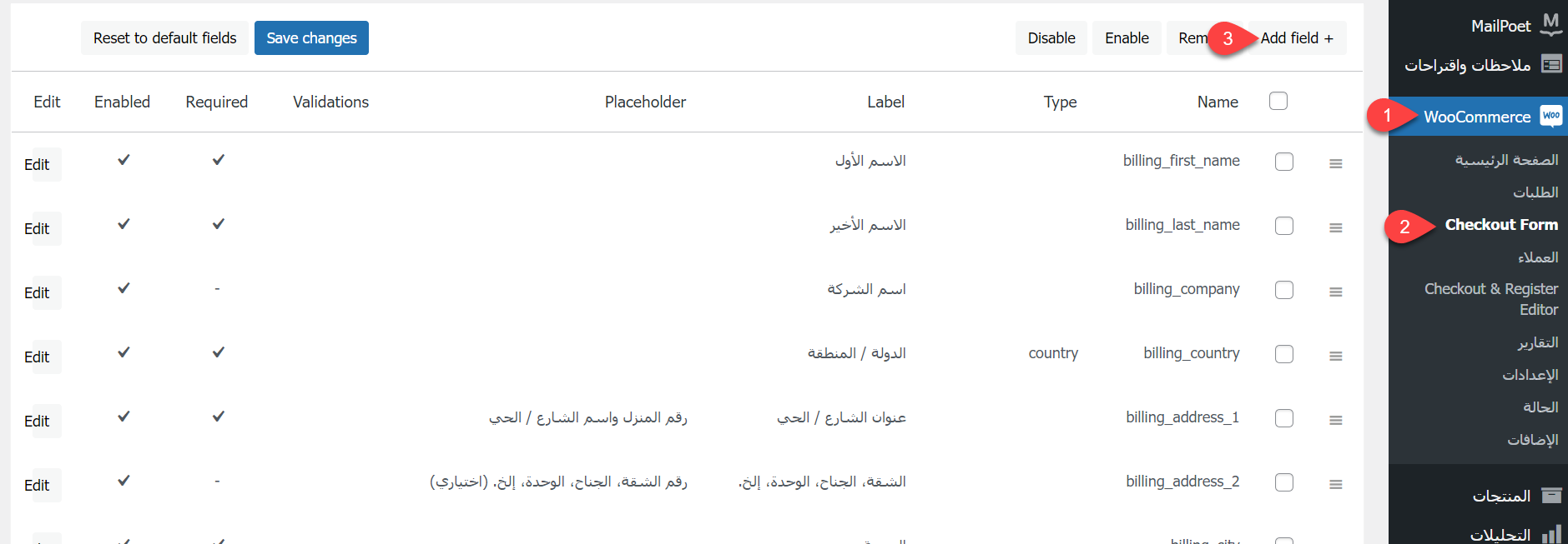 وفيما يخص إضافة حقل لاسم المرسل، فيمكنك تنفيذ ذلك باستخدام إضافة [سجل الدخول لترى الرابط]. بعد تنصيب الإضافة، توجه إلى WooCommerce --> Checkout Form، ثم انقر على زر (+ Add field) لإضافة حقل لاسم المرسل.