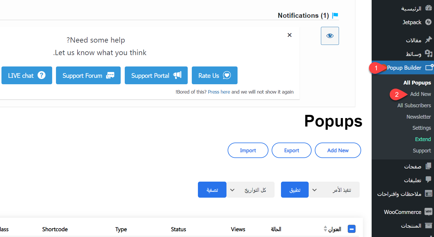 أولًا قم بتنصيب وتفعيل الإضافة على موقعك الإلكتروني. بعد ذلك ابدأ بإضافة نافذة منبثقة من خلال Popup Builder --> Add New.