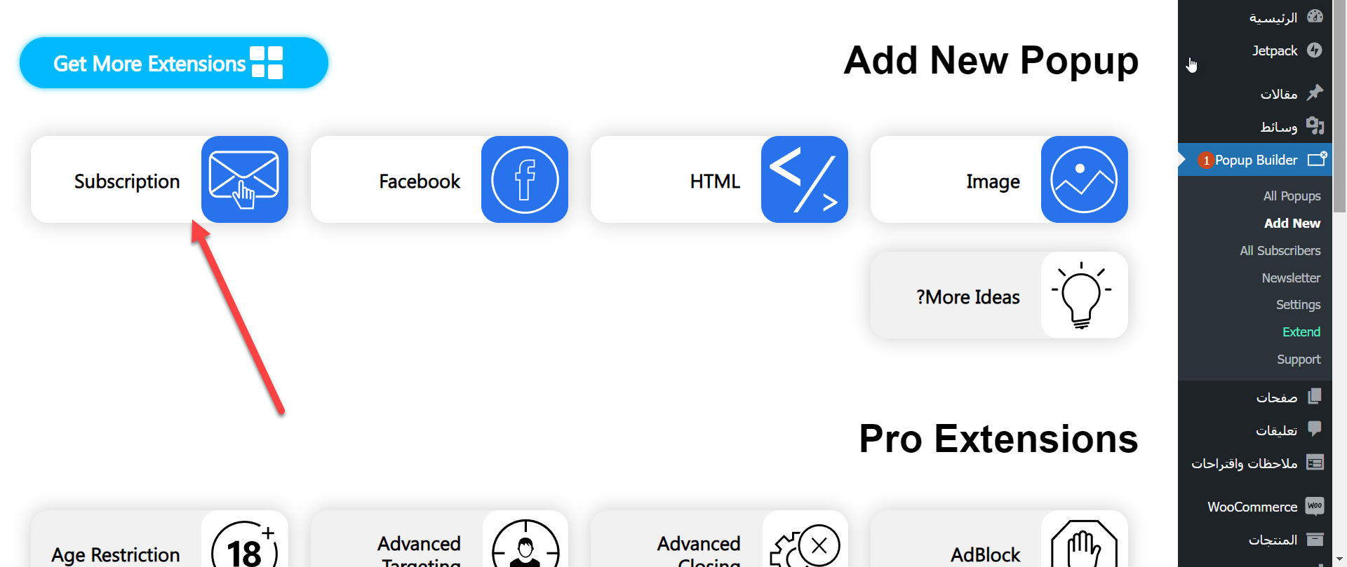 ستظهر لك صفحة تطلب منك اختيار نوع النافذة المنبثقة. يمكنك النقر على HTML لكي تقوم بتصميم النافذة المنبثقة حسبما تريد من خلال محرر المكونات، لكن من المفضل أن تختار نوع النافذة التي تريدها بدقة إذا كان متوافرًا ضمن الخيارات، إذ سيسمح لك ذلك بتحميل البيانات المرسلة أو المعبأة بواسطة الزوار على شكل ملف CSV لاحقًا. إذا أردت إظهار نافذة منبثقة للاشتراك مثلًا، انقر على (Subscription).