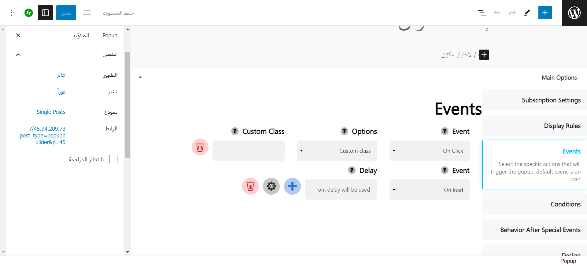 في الأسفل يمكنك ضبط إعدادات النافذة المنبثقة من خلال التبويبات الموجودة. يختص تبويب Events بالأحداث التي ستظهر النافذة المنبثقة عند تتم، ويختص تبويب Conditions بالشروط التي يجب أن تكون موجودة لتظهر النافذة المنبثقة عندما يتم أحد الأحداث التي حددت أن تظهر عندها.