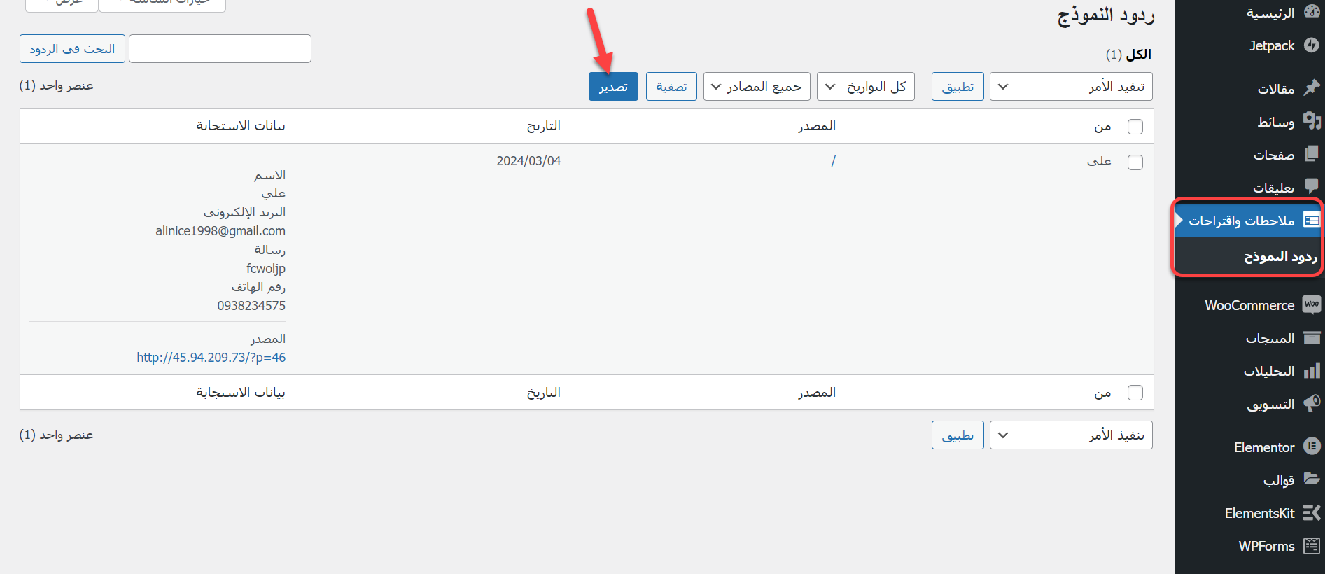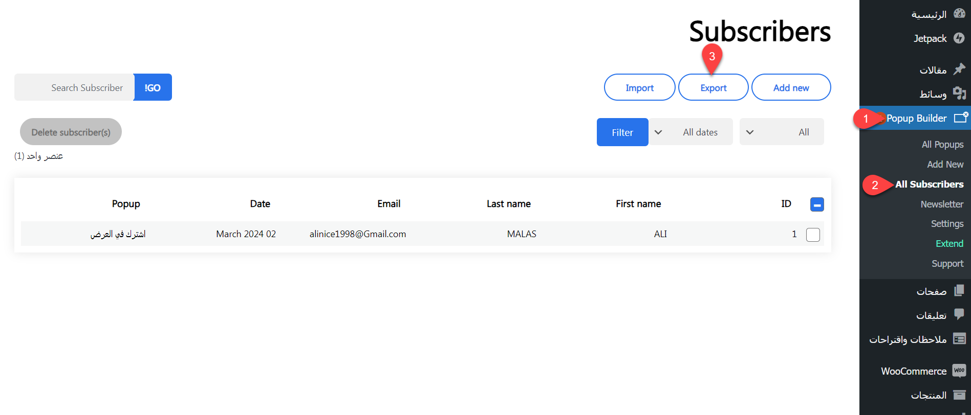 ويمكنك من خلال صفحة Subscribers أن تطلع على بيانات الزوار التي أُدخلت، وكذلك يمكنك تحميل البيانات على شكل ملف CSV من خلال النقر على زر Export.