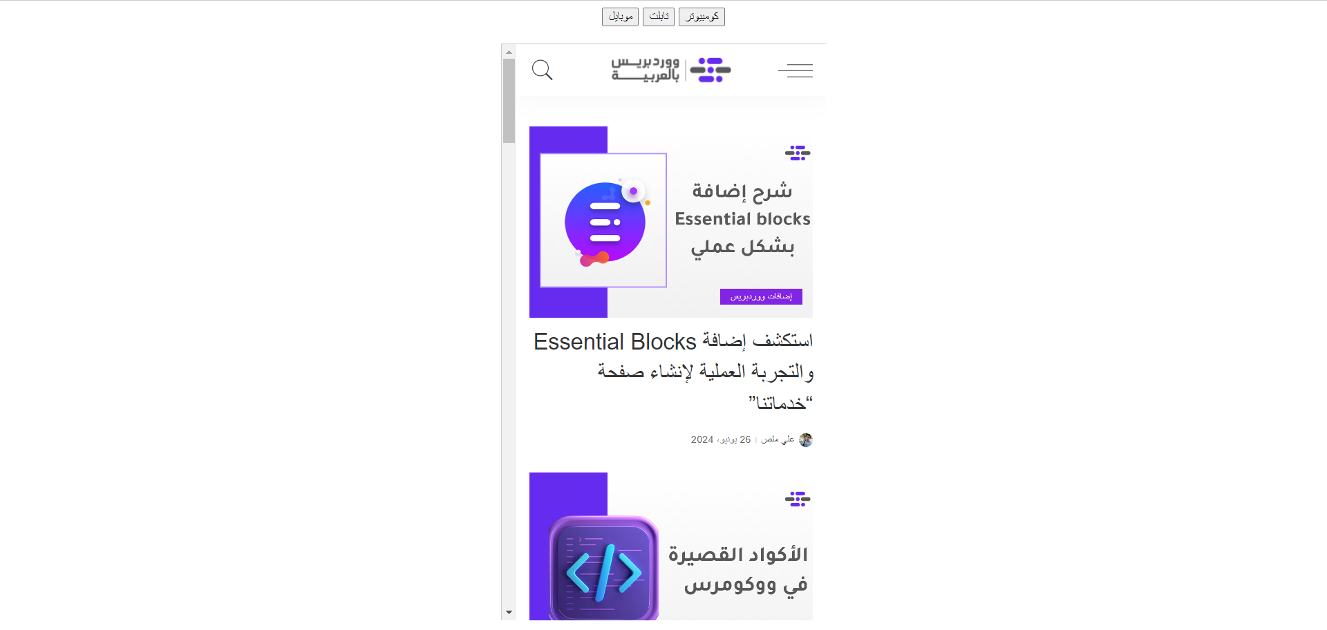 أخي ووردبريس سيعرض النسخة الملائمة لجهاز الزائر دون الحاجة لأن يفعل أي شيء، أما أنت كصاحب موقعك، فإذا أردت الاختبار، تستطيع استخدام أداة الفحص في متصفح جوجل كروم على الكومبيوتر، حيث تقوم بالانتقال إلى وضع الفحص من خلال النقر على مفاتيح Ctrl + Shift + C من لوحة المفاتيح، ثم تنقر على أيقونة التبديل إلى شريط أدوات الجهاز، ويمكنك بعد ذلك تصغير أو تكبير العرض تبعًا لما تريد من خلال المقابض.