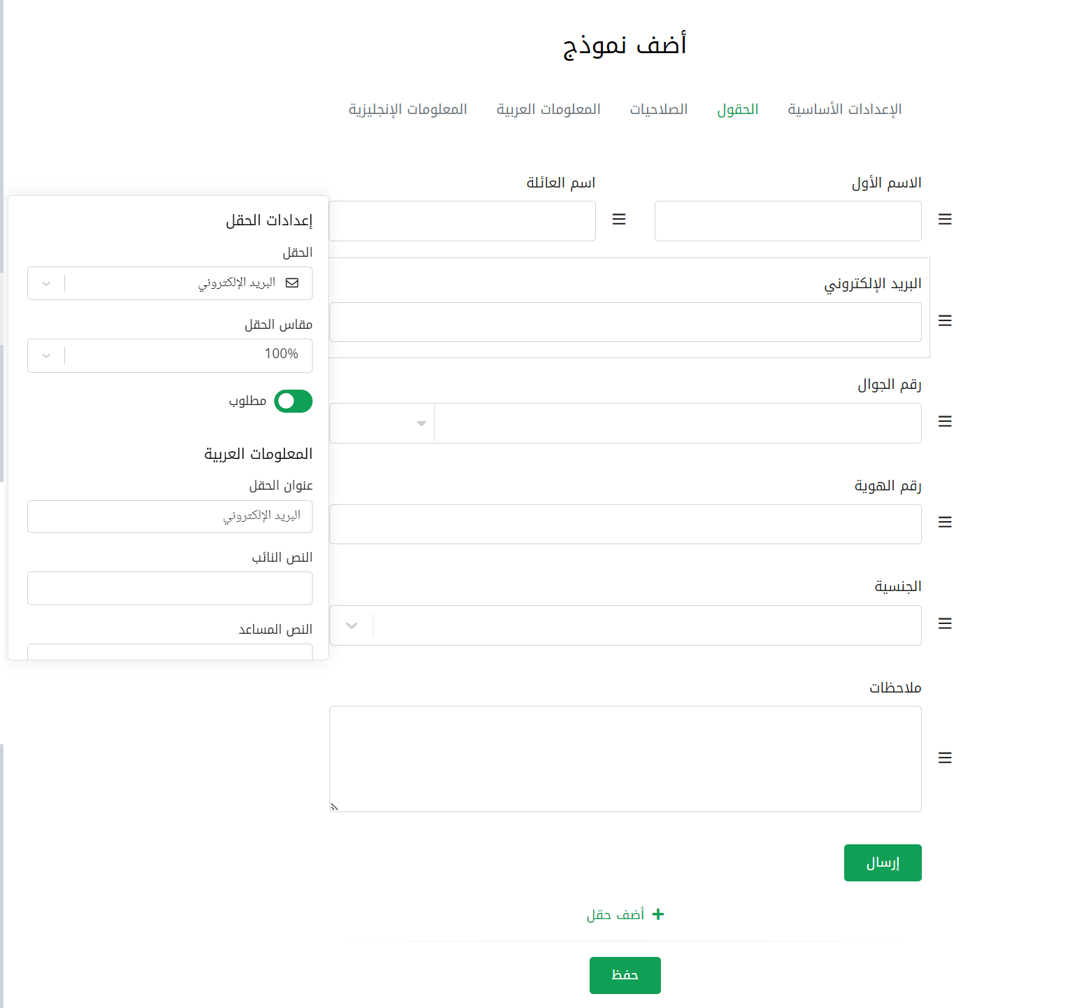 ستظهر لك صفحة تتضمن تبويبات عدة لتحديد خصائص النموذج الذي تريد إضافته. تأكد من ضبط الإعدادات كما تريد، واحرص على تضمين الحقول التي تحتاجها في النموذج من خلال تبويب (الحقول). حيث يمكنك إضافة حقل من خلال زر (أضف حقل)، ويمكنك ضبط خصائص أي حقل من خلال اختيار الحقل بالنقر عليه، ثم ضبط خصائصه من القسم الذي يظهر على الجانب الأيمن.