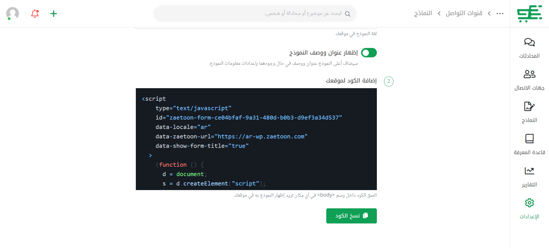 بعد ضبط الخيارات في كل التبويبات حسبما تحتاج، انقر على زر (حفظ) في الأسفل. ستظهر لك تفاصيل النموذج، ومنها الكود.