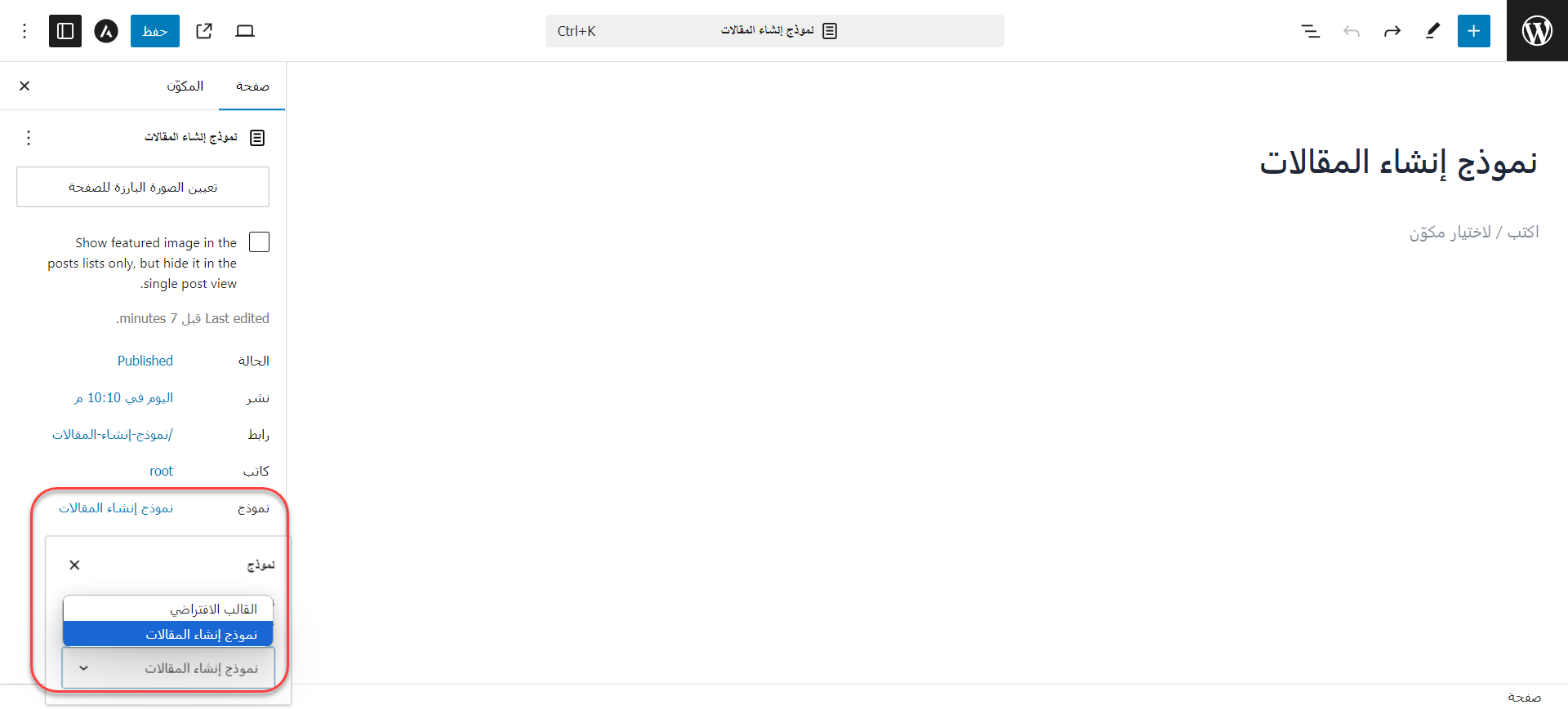 بعد ذلك، أنشئ صفحة جديدة في موقعك، واختر نموذج الصفحة (نموذج إنشاء مقالات).