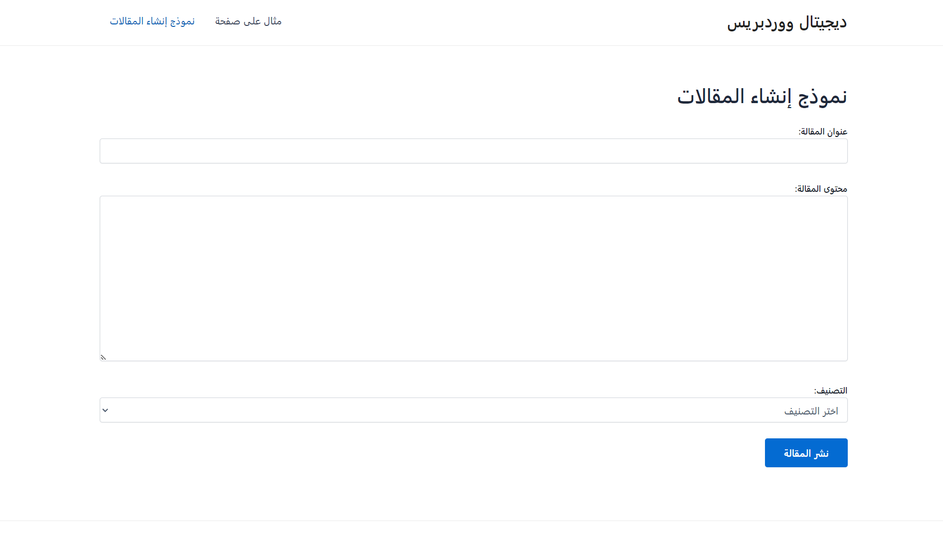 بعد، ذلك انشر الصفحة بالنقر على زر النشر، ثم قم بزيارتها وستجد أنها تتضمن نموذجًا بسيطًا يسمح للزائر بإدخال بعض البيانات ومن ثم النقر على زر نشر المقالة ليتم نشر البيانات المدخلة كمقالة.
