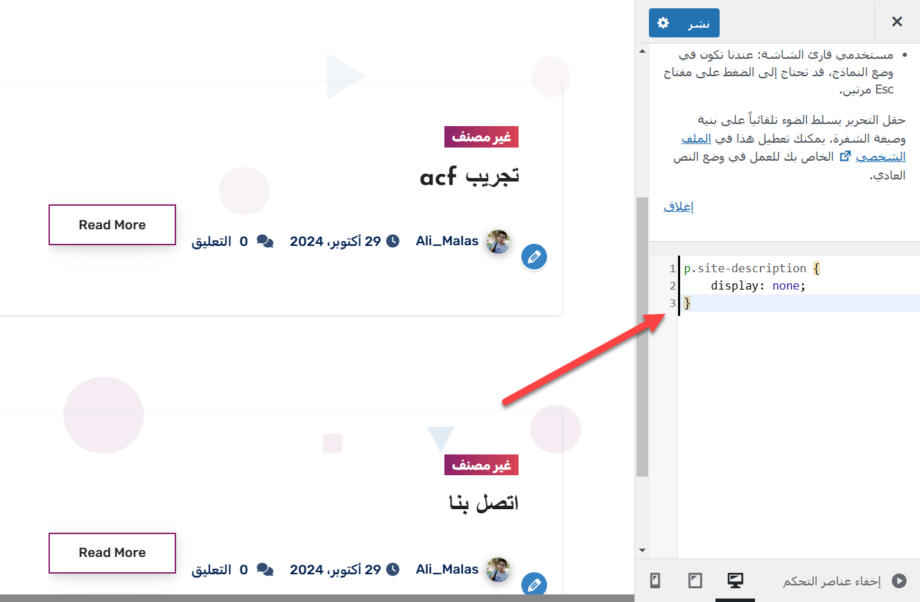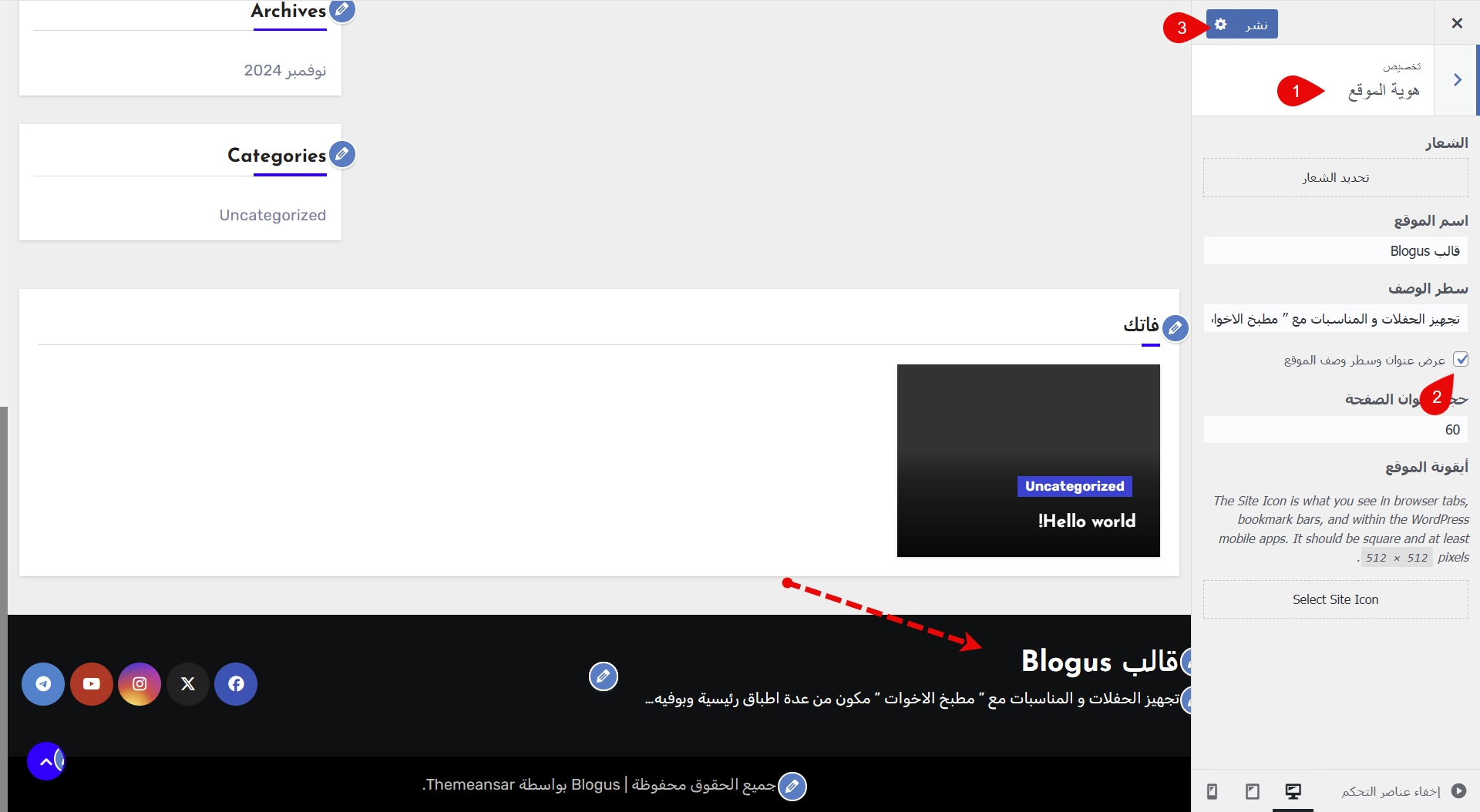 - اضغط على نشر لحفظ التغييرات وستلاحظ اختفاء كلا من العنوان والوصف في كلا من الهيدر والفوتر.
