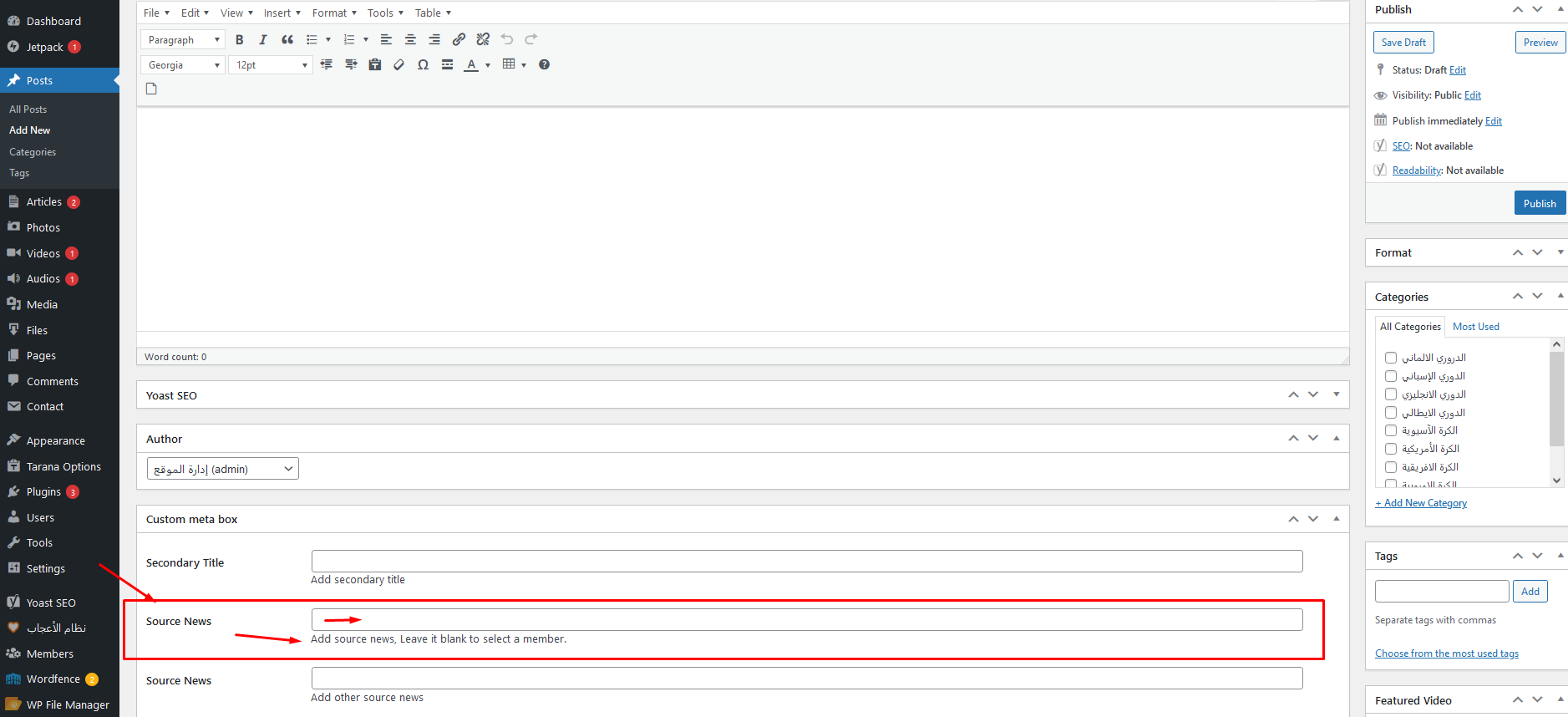 أما بخصوص خانة Source news فلأنها مهيئة لتخزين قيمة نصية، أجد أنه ممكن استدعائها في القالب الجديد. في الغالب ستجدها مخزنة في جدول Postmeta وحينها ستحتاج فقط لمعرفة الـ Field name المستخدم من قبل القالب القديم لهذه الخانة والمخزن في قاعدة البيانات وبعدها تجرب تستدعيه عبر الحقول المخصصة الافتراضية في محرر المكونات أو إنشاء مثيل له باستخدام ACF مثلا مع تعديل كود الصفحة لكي يظُهر الحقول المخصصة.