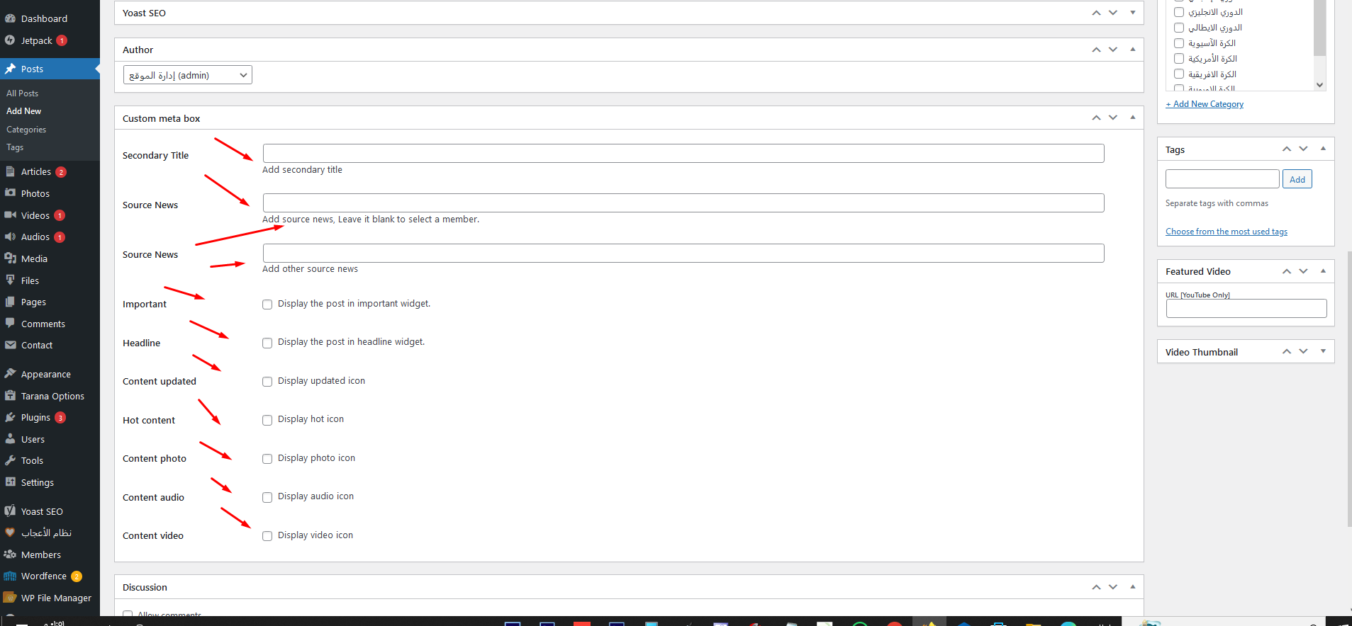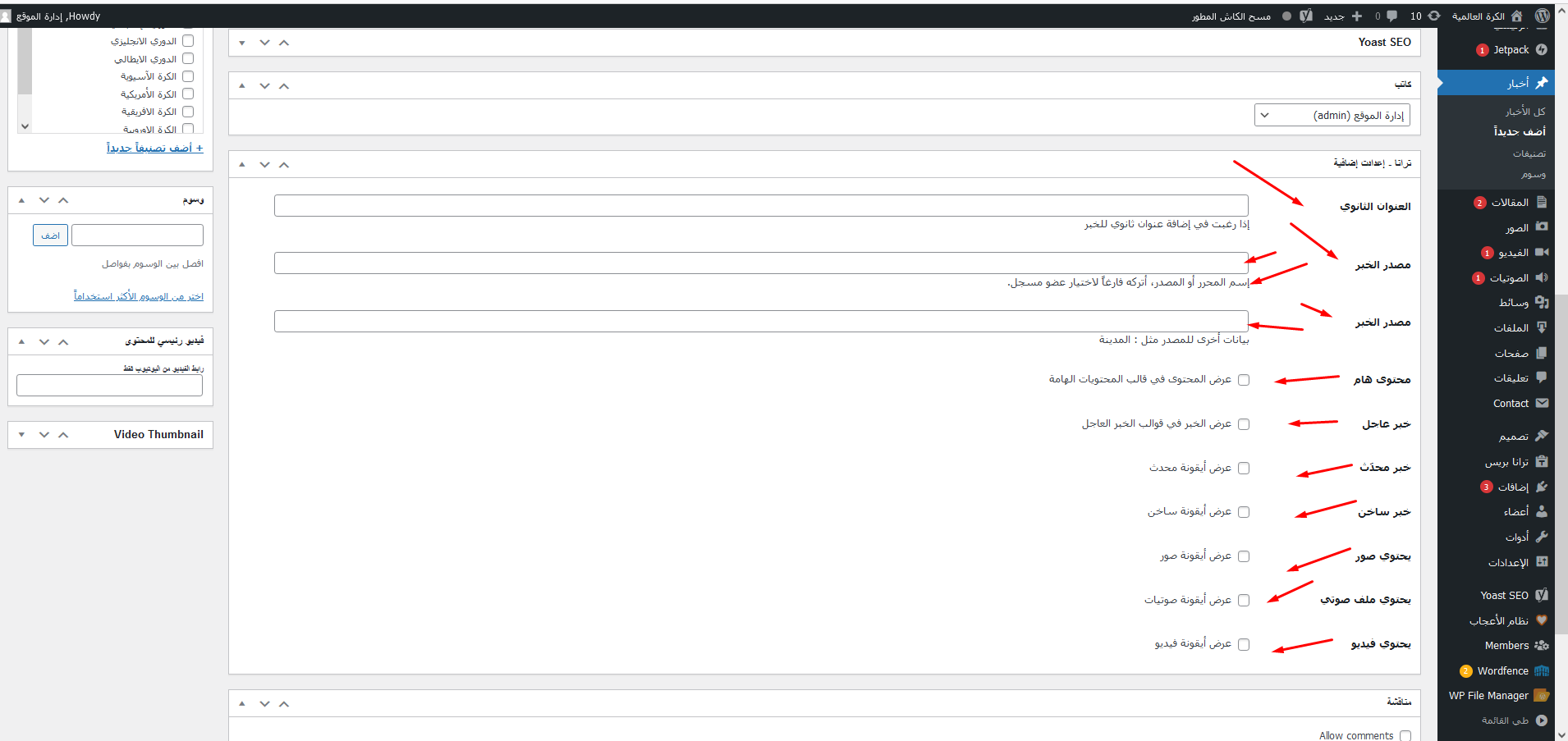 بناءً على الصور المرفقة، هذه ليست حقول مخصصة وإنما هي خيارات مدمجة مع القالب القديم. خيارات مثل عرض أيقونات معينة كأيقونة الأخبار الساخنة أو تخصيص ظهور المقالات كعرض المحتوى الهام والعاجل، كلها مصممة لتفعيل ميزات خاصة في القالب القديم.