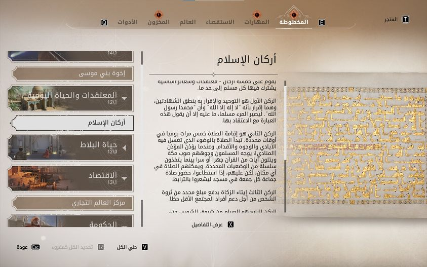 دي قائمة المخطوطات اللي بتجمعها من داخل اللعبة واللي بتعرضلك معلومات خاصة بالمخطوطات دي.. الجدير بالذكر إن الشاشة دي تنفع اوي تكون UI/UX محترم تعمل بيها موقع إسلامي بيتكلم عن مواضيع مختلفة او اقسام مختلفة في الثقافة الاسلامية..
