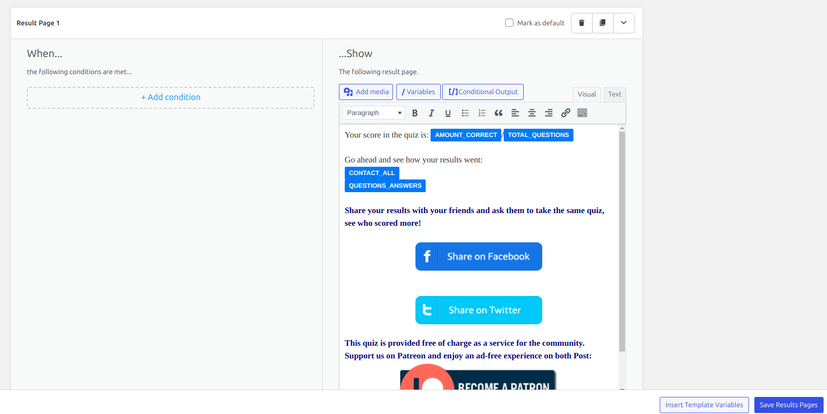 الجميل فيها هي أنها كثيرة التخصيص؛ فيمكنك مثلًا تخصيص صفحة النتيجة لتعرض النتيجة بطريقة معينة للطالب + تحثّه على مشاركة نتيجته على مواقع التواصل، مما يجلب بدوره المزيد من الزوّار لموقعك:
