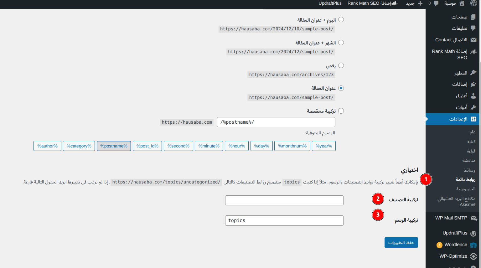 مثلًا افرض أنك تعمل على موقع محتوى احترافي وتريد تغيير كلمة "tags" إلى "topics"، فيمكنك بسهولة فعل ذلك من الإعدادات --> الروابط الدائمة، ثم كتابة الكلمة التي تريدها كما في الصورة: