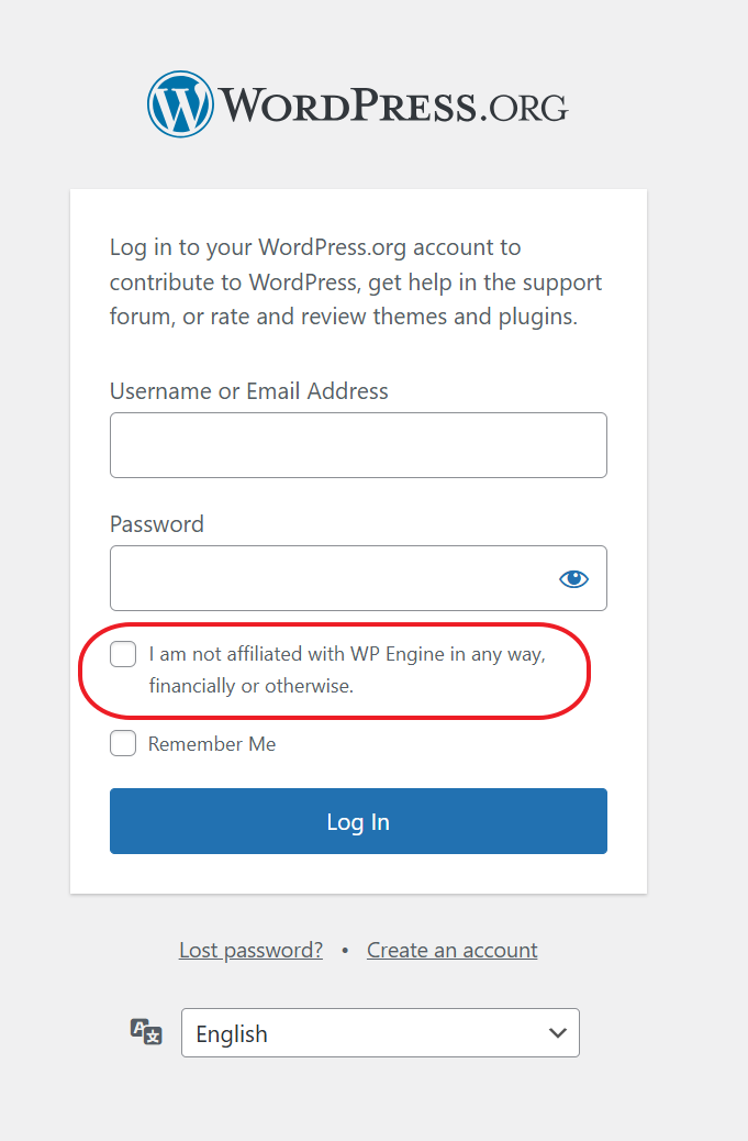 وفوقها أضاف مربع اختيار checkbox إلى شاشة تسجيل الدخول إلى موقع wordpress.org ليجبر الناس على التبرأ من أي علاقة بـWPEngine: