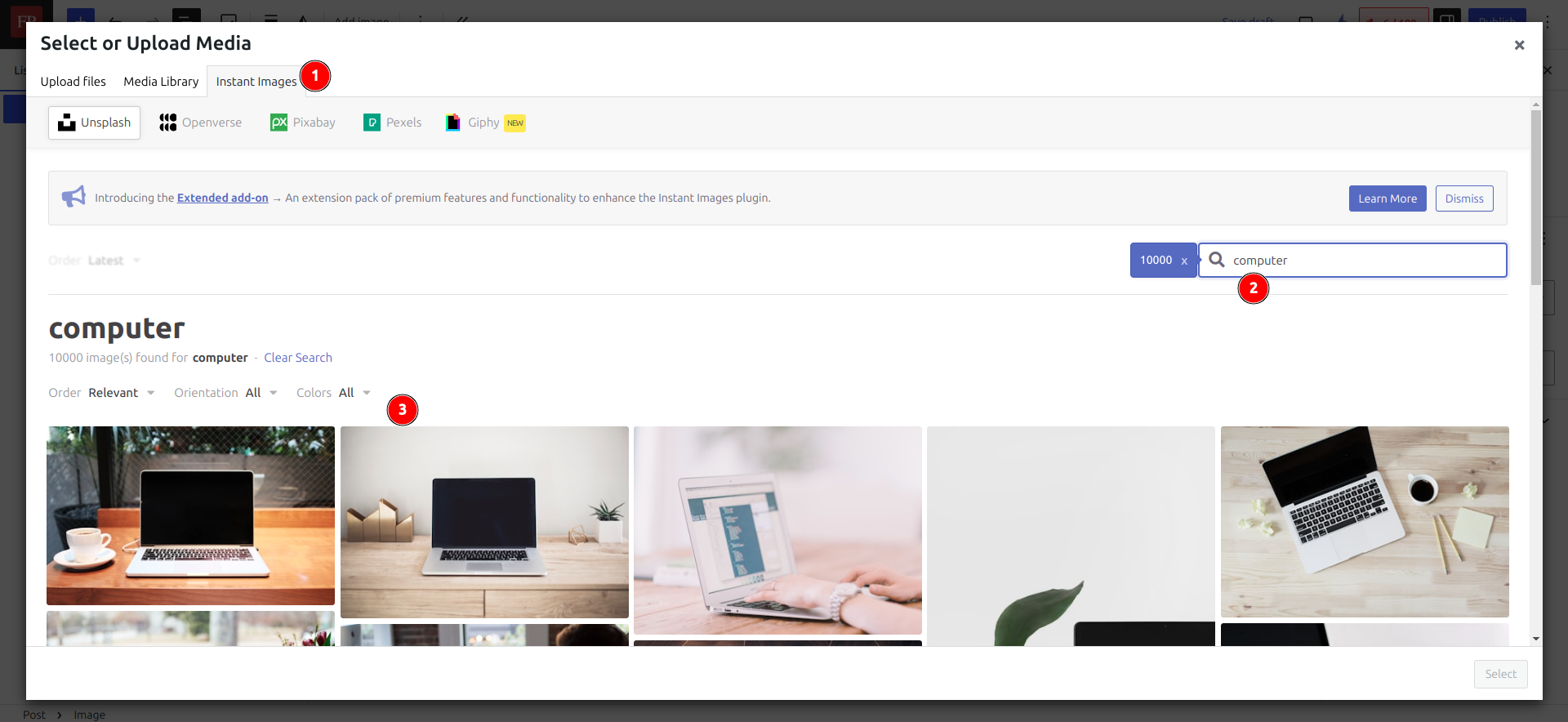 يمكنك استعمال إضافة Instant Images المجانية لذلك من متجر إضافات ووردبريس: