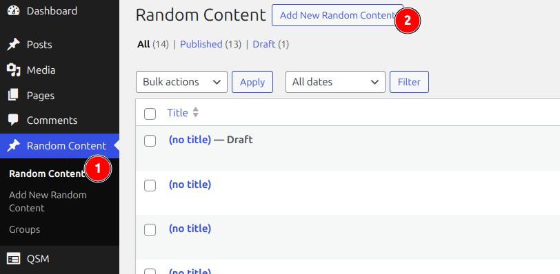 اذهب بعد التثبيت إلى صفحة الإضافة واختر "Add new Random Content" لإضافة محتوى جديد:
