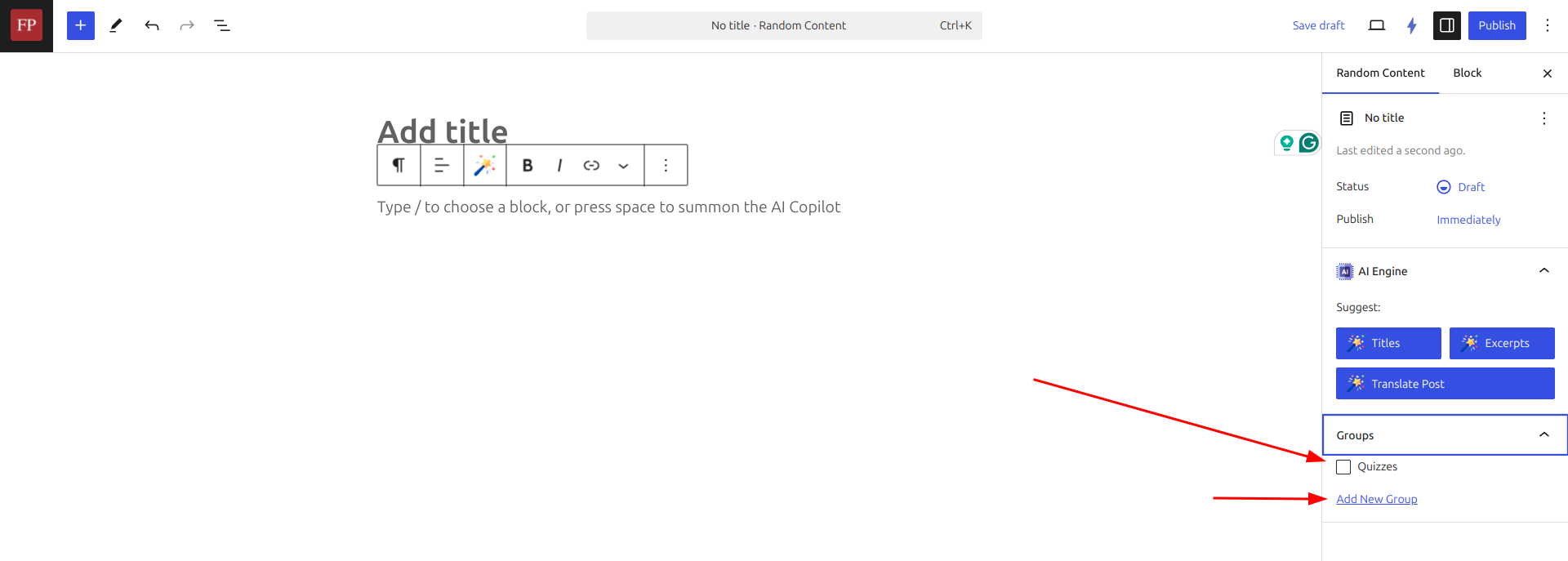 سترى صفحة محرر ووردبريس عادية، ولكن الخيار الذي يجب عليك الانتباه إليه هنا هو خيار "المجموعة" أو "Groups" من الشريط الجانبي، وهو الخيار الذي يسمح لك بتصنيف هذا المحتوى العشوائي كجزءٍ من مجموعة عشوائية لتتمكن من عرضها لاحقًا على موقعك: