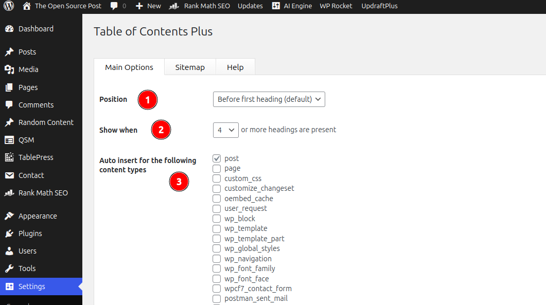 - هنا تختار أنواع المحتوى التي تريد إظهار جدول المحتويات عليها، مثل الصفحات أو المقالات وغيرها.