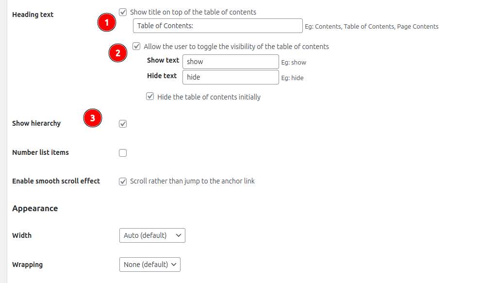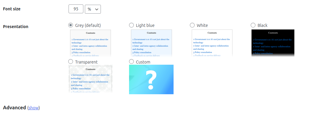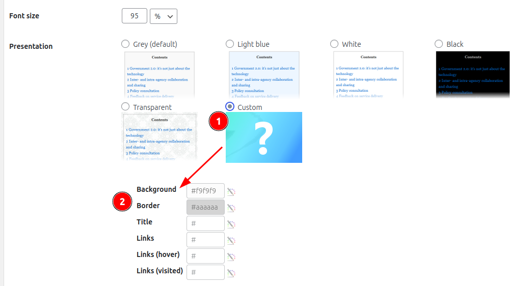 هناك خيارات أخرى أيضًا يمكنك تخصيصها كيفما تحب. يمكنك مثلًا اختيار شكل وسمة جدول المحتويات حتى يلائم شكل موقعك: