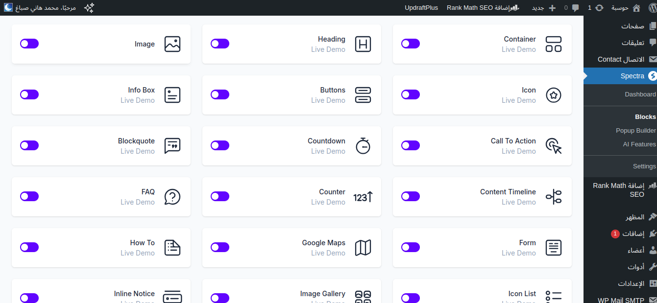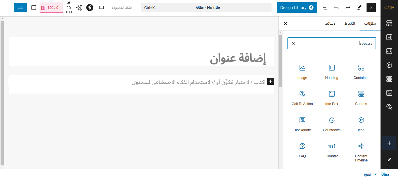الآن إن ذهبتَ إلى صفحة إنشاء مقالة جديدة فستجد جميع وحدات إضافة Spectra جاهزة للإنشاء من محرر المكونات نفسه: