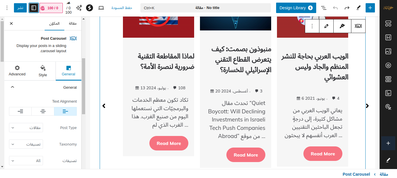 إن اخترتَ Post Carasoule مثلًا فستجد سحّابًا للمواضيع قد أُنشئ في الصفحة، ويمكنك التحكم في الكثير من إعداداته من الشريط الجانبي: