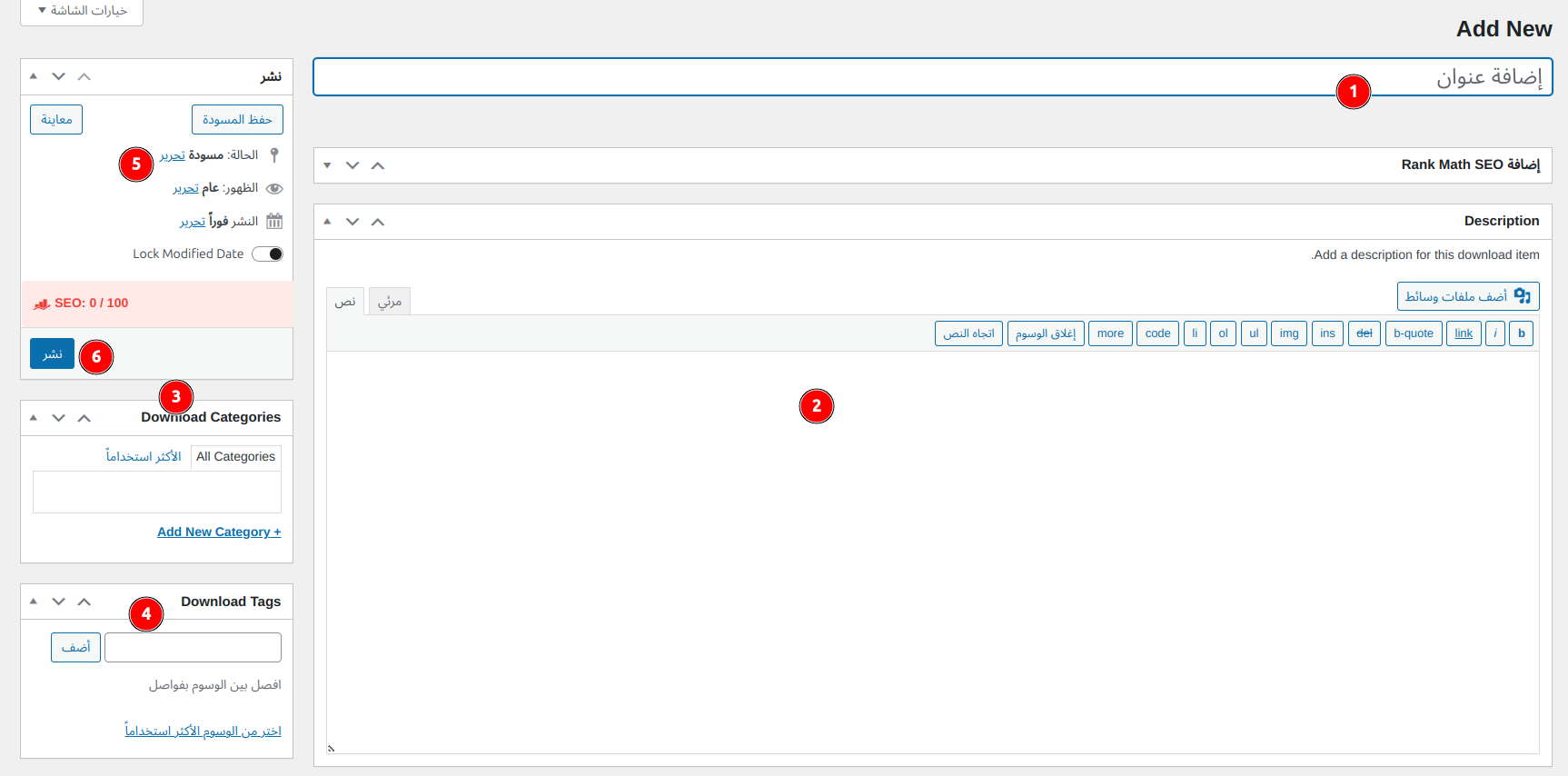 ستجد محرر ووردبريس التقليدي بانتظارك، وستتمكن من استعماله لكتابة عنوان ووصف الملف بالإضافة إلى اختيار عددٍ من الخيارات المرتبطة به: