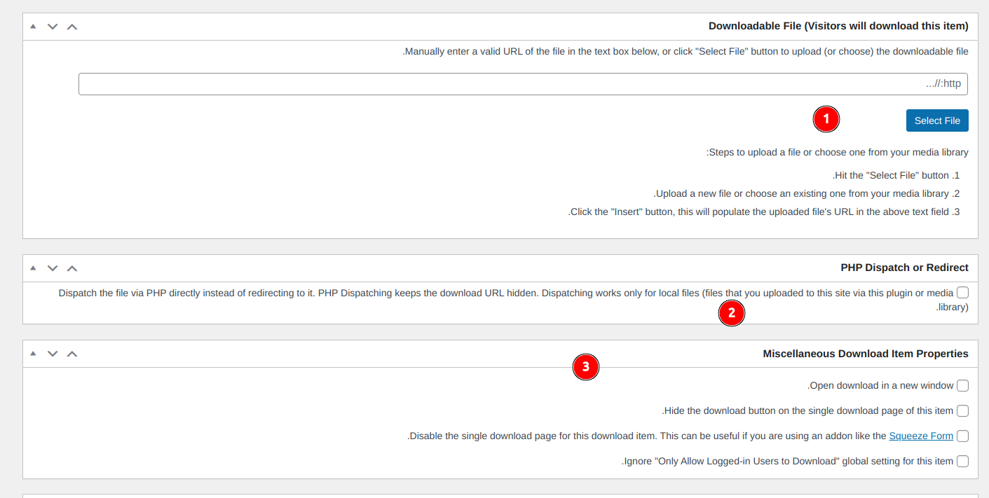 - من هنا يمكنك تحميل الملف الذي تريد عرضه للتحميل لمستخدمي موقعك. يمكنك استخدام ملف مرفوع على موقعك بالفعل أو اختيار ملف خارجي مُستضاف على موقعٍ بعيدٍ إن شئت.