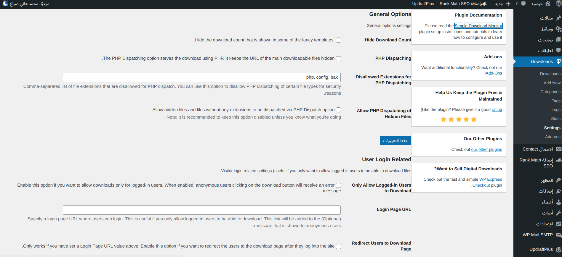 تمتلك الإضافة خيارات كثيرة يمكنك تعديلها لمزيدٍ من التخصيص من صفحة الإعدادات الخاصة بها، مثل السماح بالتحميل للمستخدمين مسجلي الدخول فقط + إعادة توجيه الزوار إلى رابطٍ معين عند التحميل، وغير ذلك من الخيارات المتقدمة: