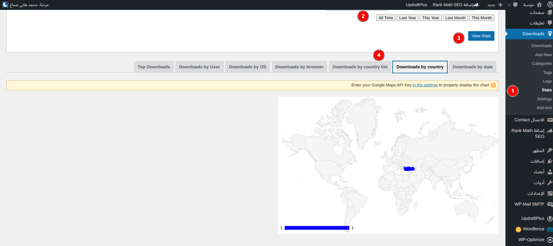 يمكنك أن ترى إحصائياتٍ عن عدد مرات التحميلات من موقعك بشكل مفصل من صفحة "stats" التابعة للإضافة: